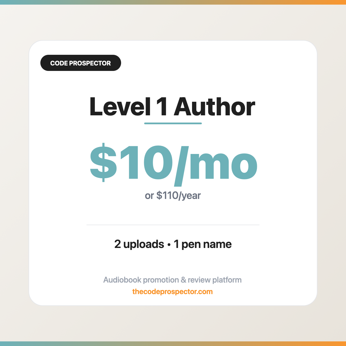 Code Prospector is an audiobook promotion and review platform that connects indie audiobook authors and narrators with engaged listeners who want to leave honest reviews. Authors upload Audible promo codes (US and UK), listeners claim codes in exchange for a real review, and you track results from your dashboard.