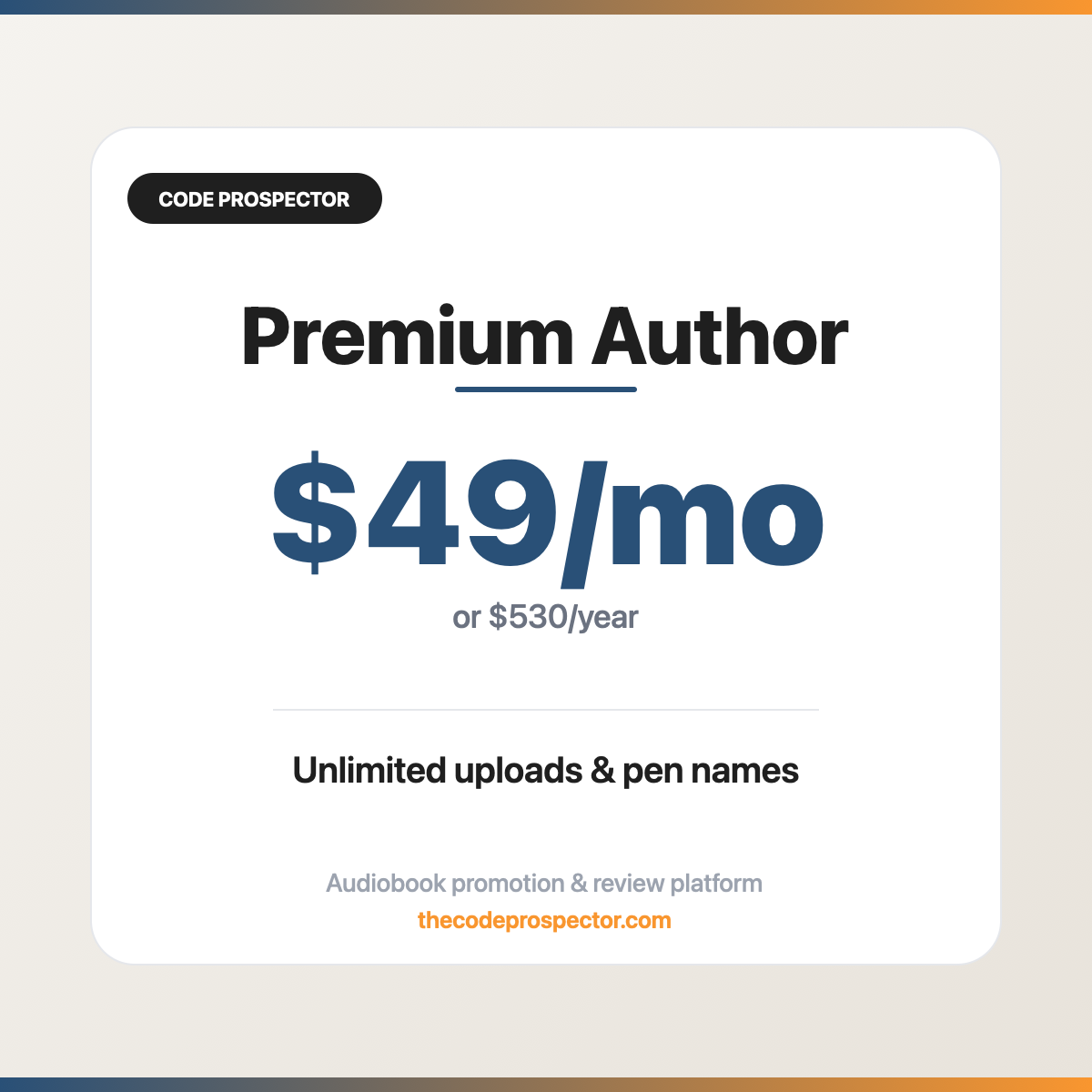 Code Prospector is an audiobook promotion and review platform that connects indie audiobook authors and narrators with engaged listeners who want to leave honest reviews. Authors upload Audible promo codes (US and UK), listeners claim codes in exchange for a real review, and you track results from your dashboard.